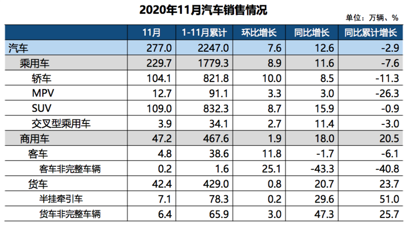 乘用車方面,11月產(chǎn)銷為232.9萬輛和229.7萬輛,環(huán)比增長11.8%和8.9%,同比增長7.5%和11.6%,創(chuàng)下年內(nèi)新高。與上月相比,四大類乘用車品種產(chǎn)銷均呈增長;與上年同期相比,多功能乘用車(MPV)產(chǎn)量有所下降,銷量小幅增長,其他乘用車品種產(chǎn)銷繼續(xù)保持增長。